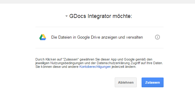 Zum Bearbeiten eines Dokuments muss der Berater sich mit dem Google-Konto docs@grenZinfo.eu anmelden. Falls der Berater sich zum ersten Mal mit dem Google-Konto anmeldet, muss er zunächst die Berechtigungen zulassen: