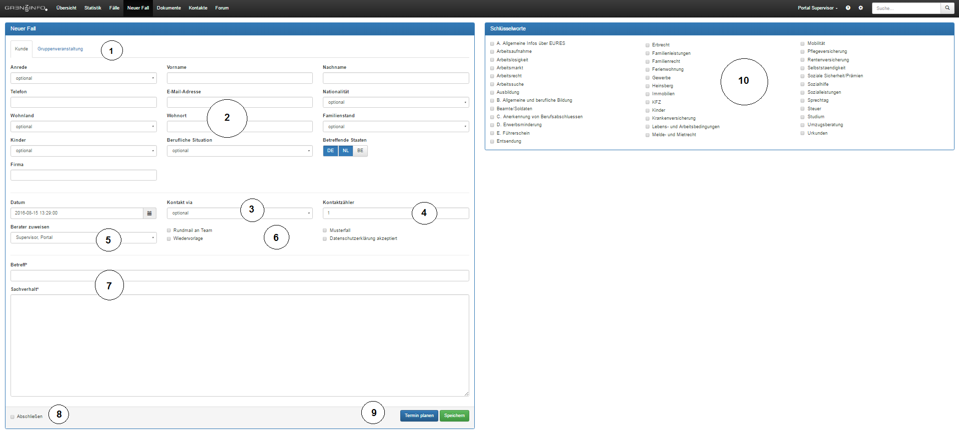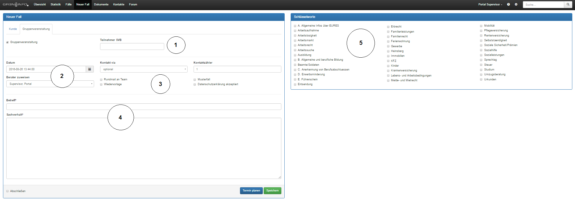 Im Anschluss an eine Gruppenveranstaltung (Sprechtag, Seminar etc.) wir ein neuer Fall mit der Option "Gruppenveranstaltung" angelegt. Die Anzahl der Teilnehmer/Besucher wird über den Kontaktzähler festgehalten. Untermengen von einzelnen Besuchergruppen können unter "Sachverhalt" notiert werden.