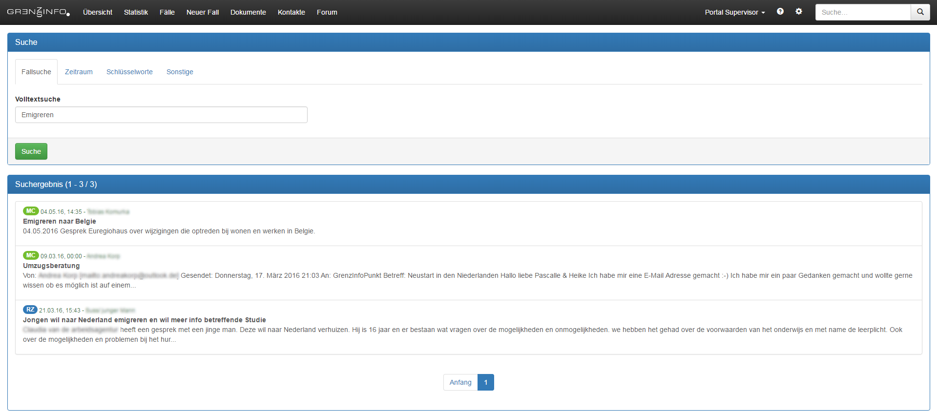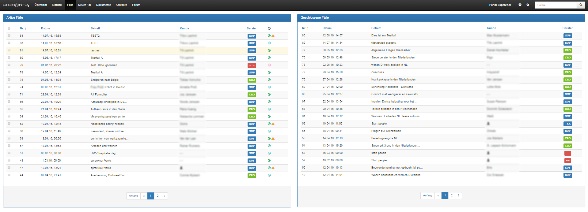 Angezeigt werden sowohl eigene Fälle, als auch Fälle von anderen Beratern sowie Fälle, welche noch von keinem Berater übernommen wurden. Auch hier sind der Status und die Anzahl der Beiträge sichtbar.