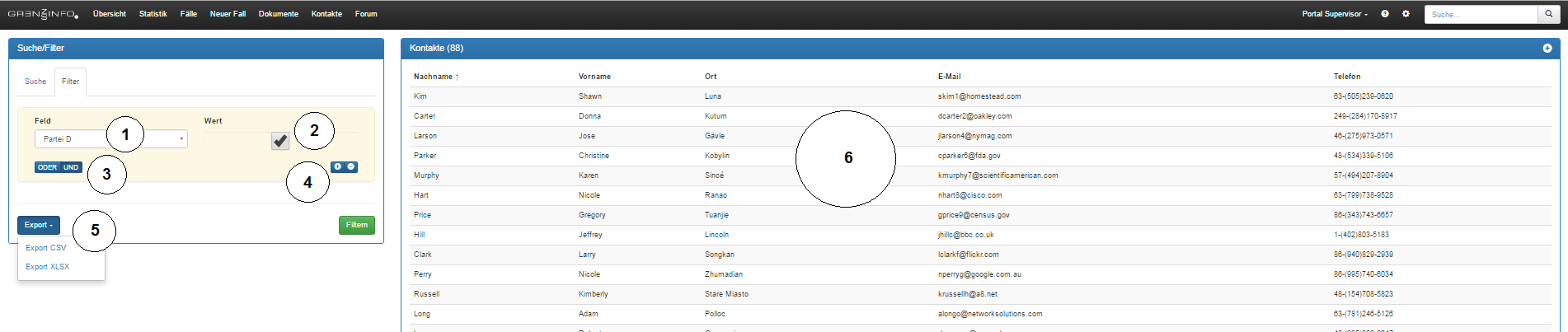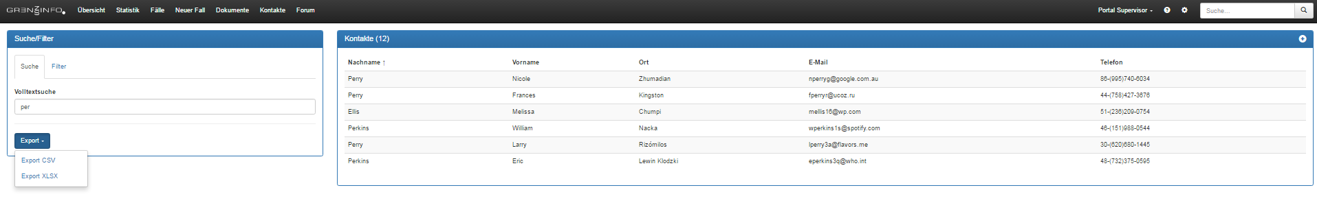 Bei der Suche nach einem Ansprechpartner den Namen in das Suchfeld eintragen. Das Ergebnis erscheint auf der rechten Seite. Das Suchergebnis kann als CSV- oder XLSX-Datei heruntergeladen werden (z.B. für die Weiterverarbeitung in MS Excel).