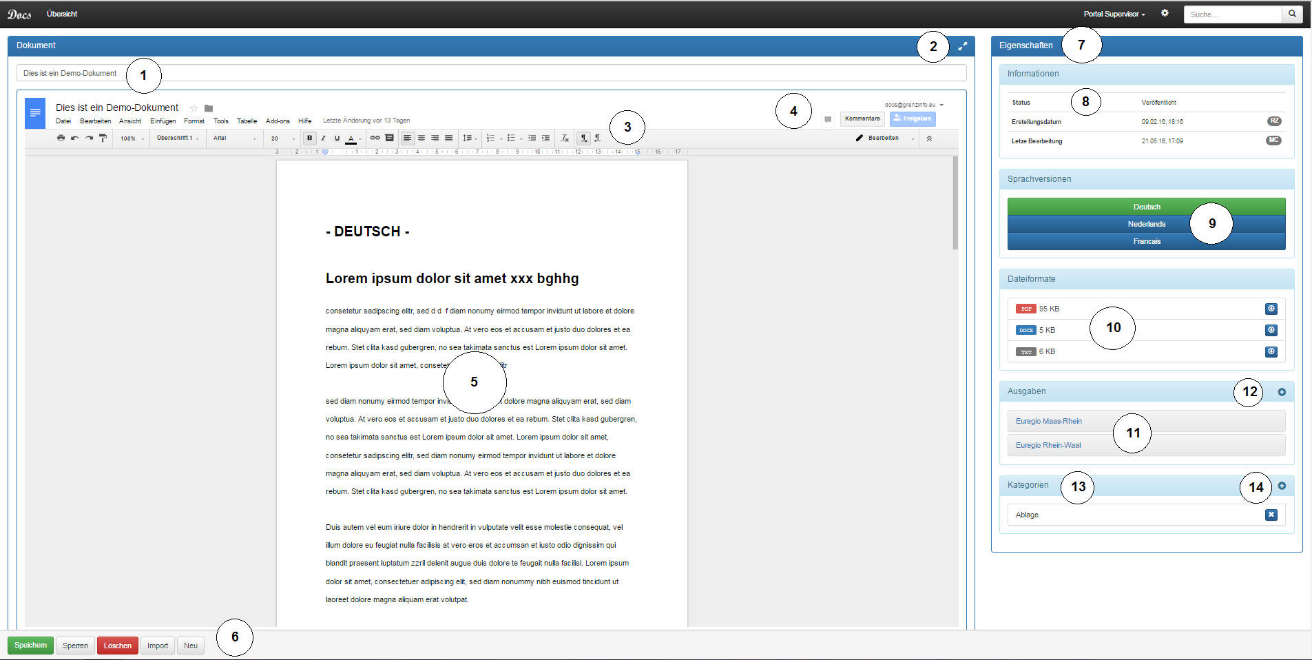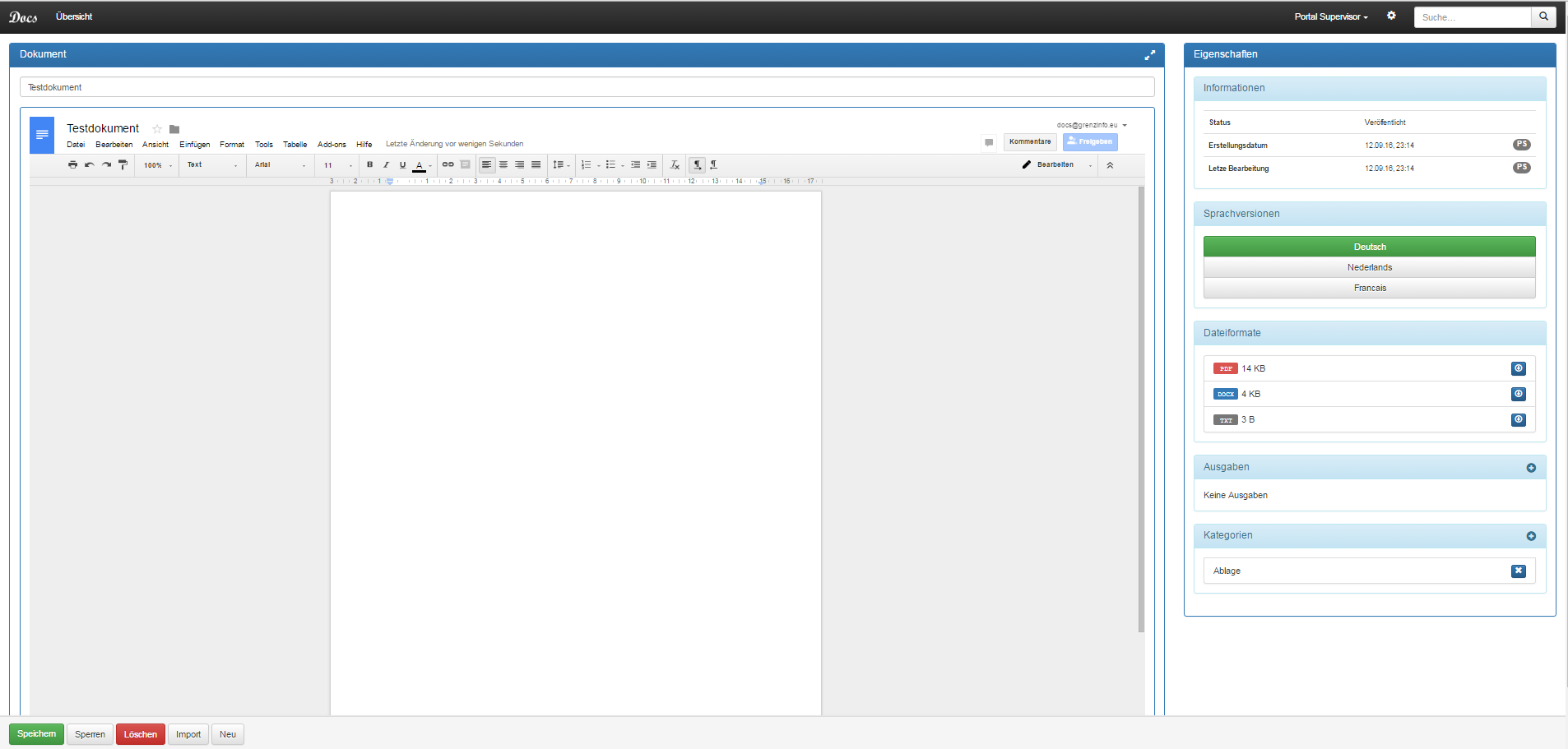 Das Dokumente-Management arbeitet mit dem Google-Dokument. Es erlaubt das Hochladen und Bearbeiten eines bestehenden Dokumentes unabhängig von dessen Dateiformat direkt im Browser. Im Google-Dokument wird lediglich der Inhalt einer Broschüre festgehalten. Durch zusätzliches Hochladen eines Layouts entsteht eine fertige Ausgabe für eine Region.