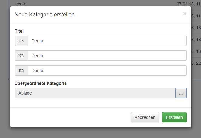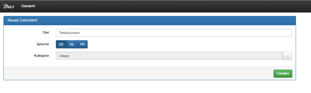 Durch Klicken auf das blaue +-Symbol in der Übersicht des Dokumente-Managements wird ein neues Dokument erstellt. Hierfür den Titel der Broschüre eingeben und die Sprachversion, die verfasst werden soll eingeben, sowie eine Kategorie bzw. Unterkategorie auswählen.