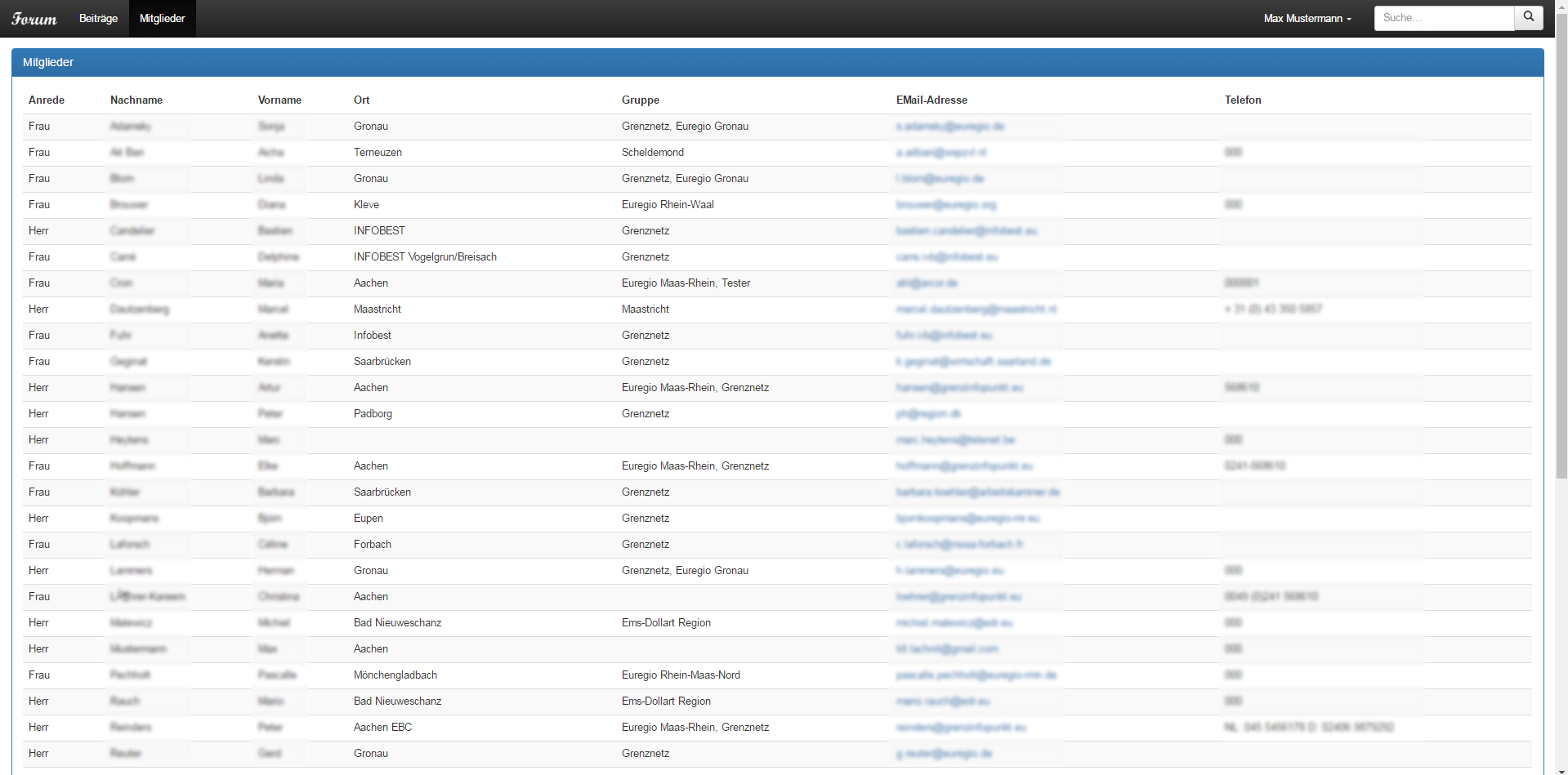 Alphabetische Liste aller Mitglieder des Forums mit Informationen über Kontaktdetails und Gruppenzugehörigkeit (Regionen).