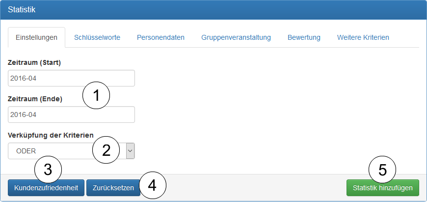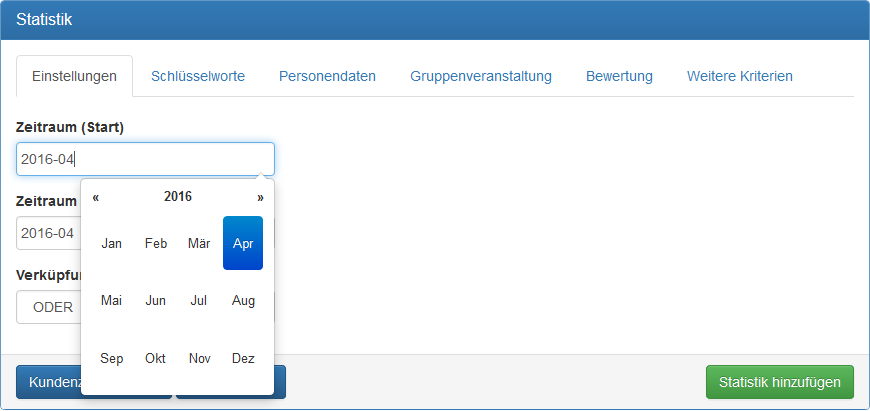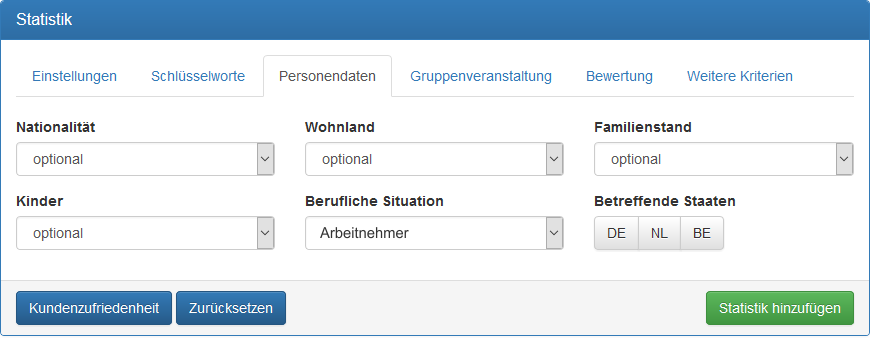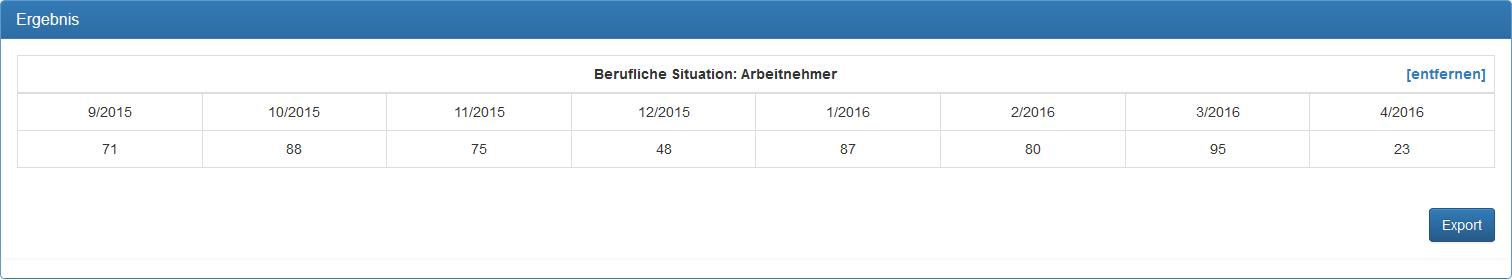 Es können nacheinander mehrere, unterschiedliche Kriterien für eine neue Auswertung angegeben werden. Die Ergebnisse werden untereinander angeordnet. Einzelne Statistiken können über die Schaltfläche "Entfernen" gelöscht werden.